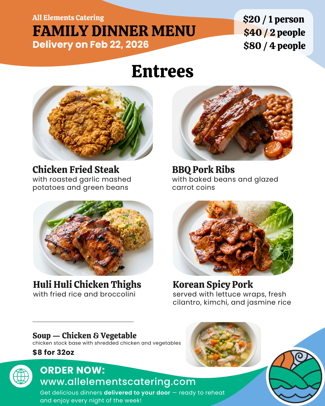 Our weekly dinners will be dropped off on Sunday or Monday, your choice! Pick up option is available by request.