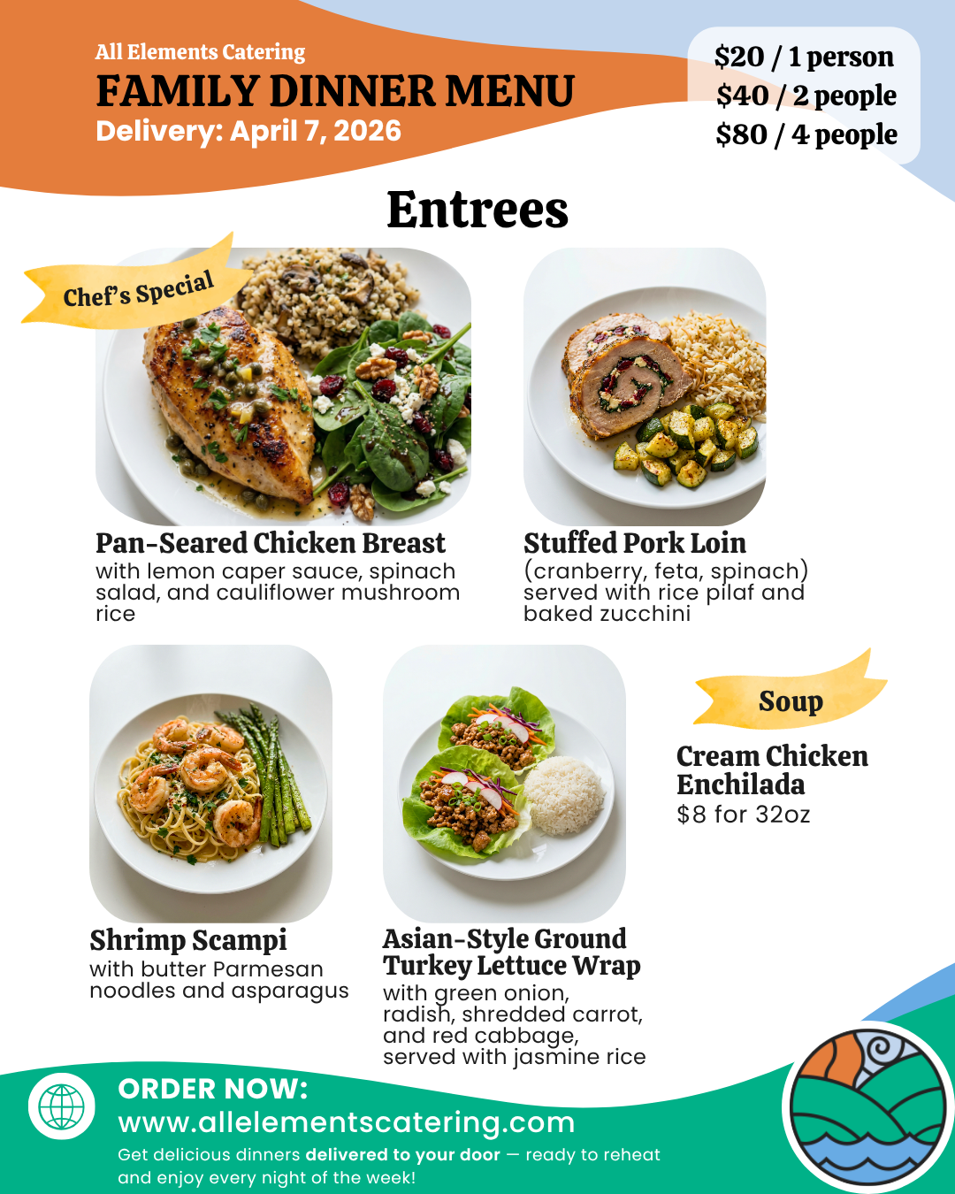 We update the menus on Mondays. Orders must be placed by Saturday at 5pm.